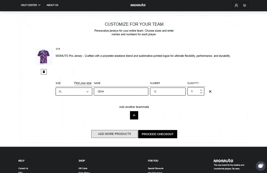 Lorsque vous êtes prêt à cliquer sur "Ajouter au Panier", vous préciserez les détails – noms, numéros et tailles spécifiques pour chaque membre de l'équipe.
