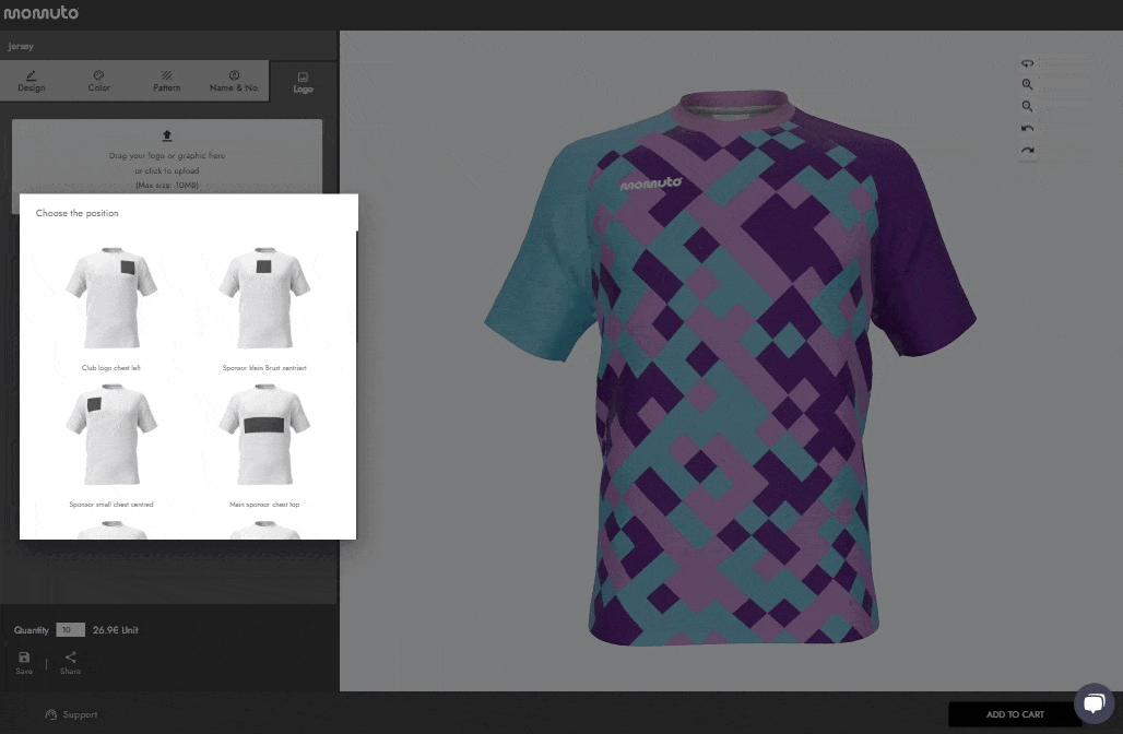 Ajoutez vos emblèmes. Plusieurs logos ? Pas de problème. Importez chacun, positionnez-les parfaitement et assurez-vous qu'ils sont de haute qualité pour un look impeccable. Nous avons des emplacements par défaut pour les designs classiques (comme les écussons de club ou les grands sponsors), mais vous êtes libre de placer vos logos où bon vous semble.